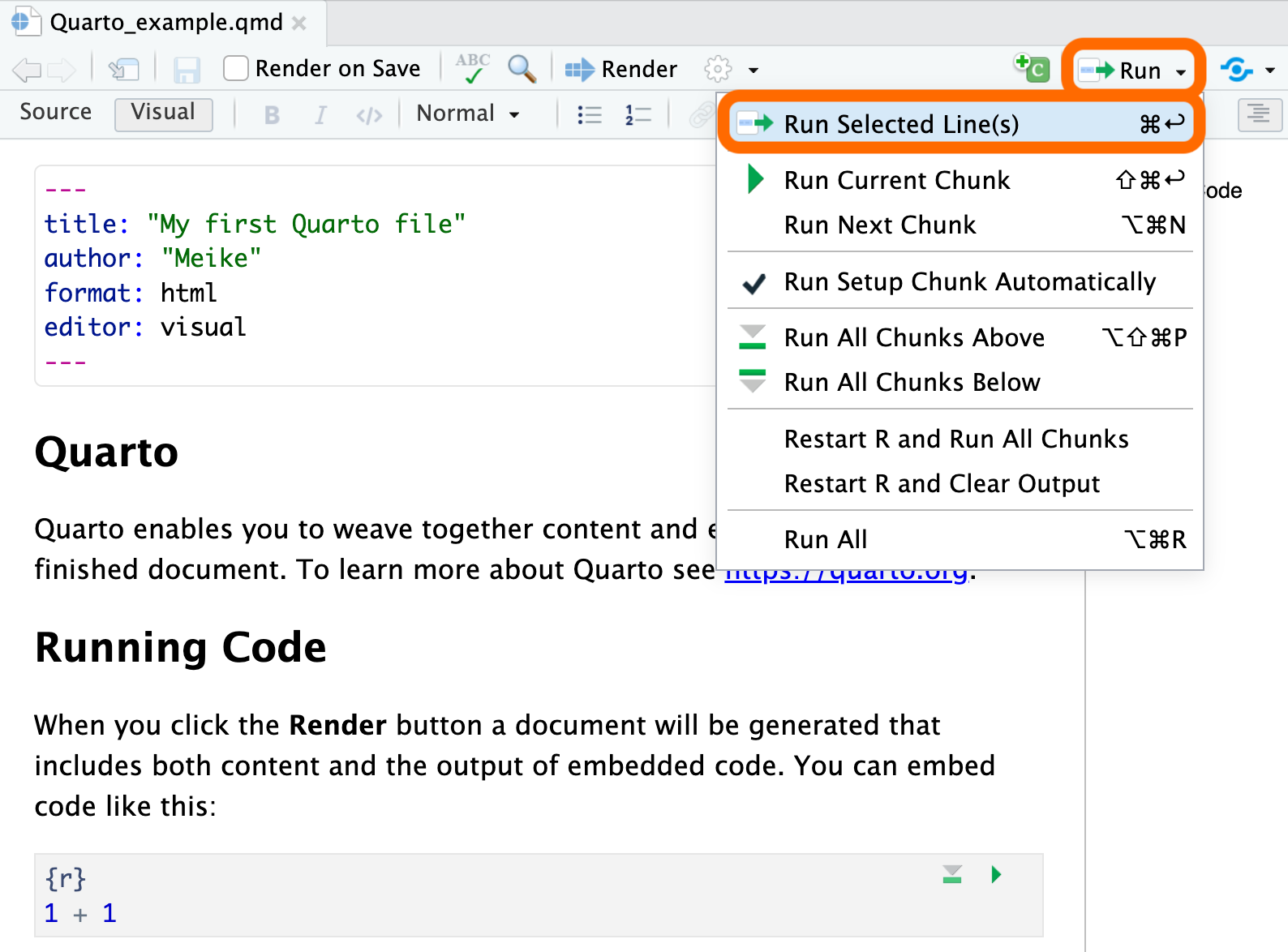 Practice: Try typing code below in your qmd (with shortcut) and evaluating it (with shortcut):