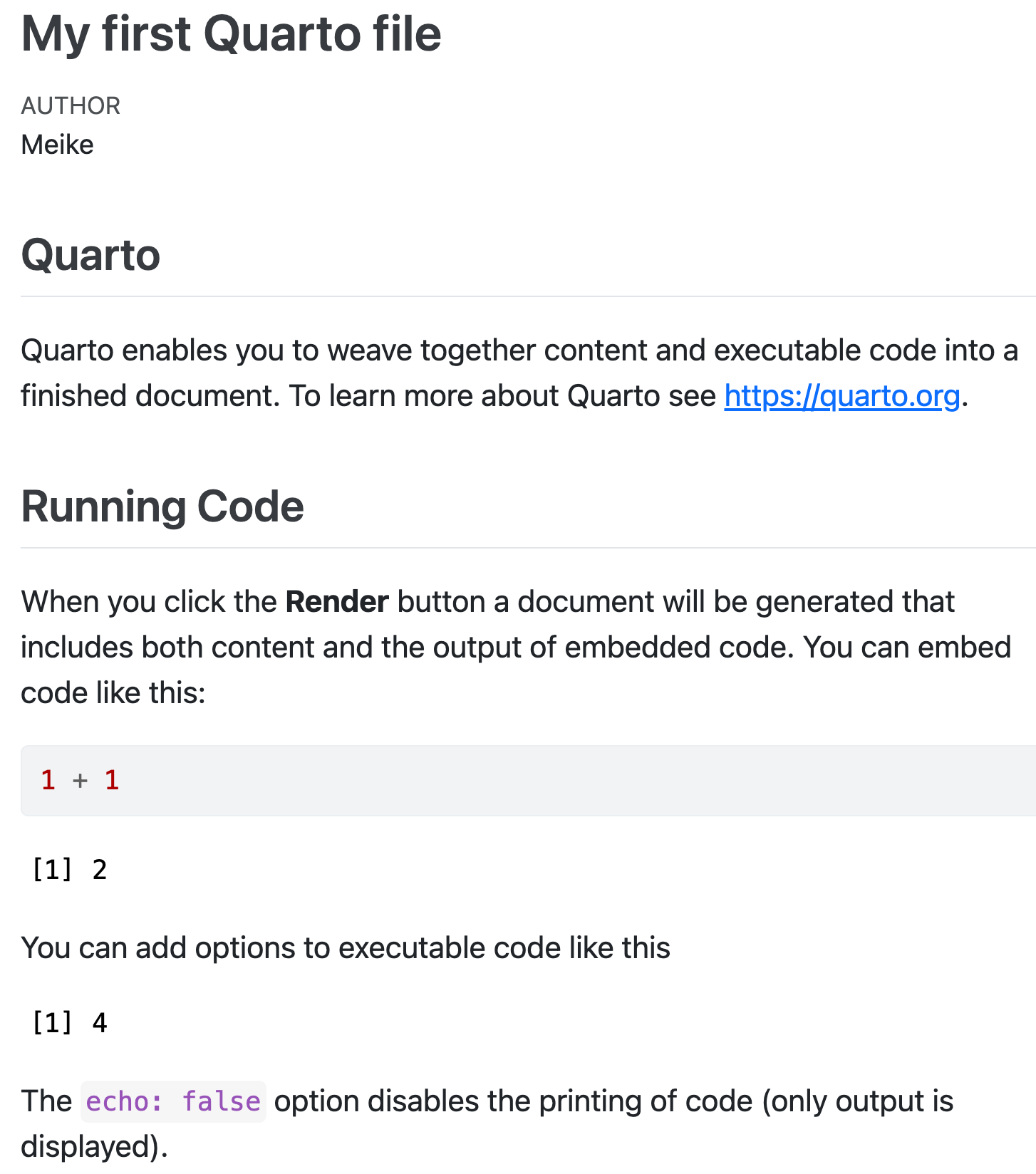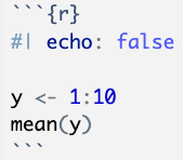 eval determines whether the R code is run or not.true.false, the code is not run but still displayed in the output:echo determines whether the R code is displayed or not.true. When set to false, the code is not displayed in the output but the output is (if eval is set to true):warning: do you want R’s warnings include in your output?message: do you want R’s messages include in your output?For a complete list of options, see the Quarto reference page for Code Cells: Knitr. In particular the sections on Code Output and Cell Output.
